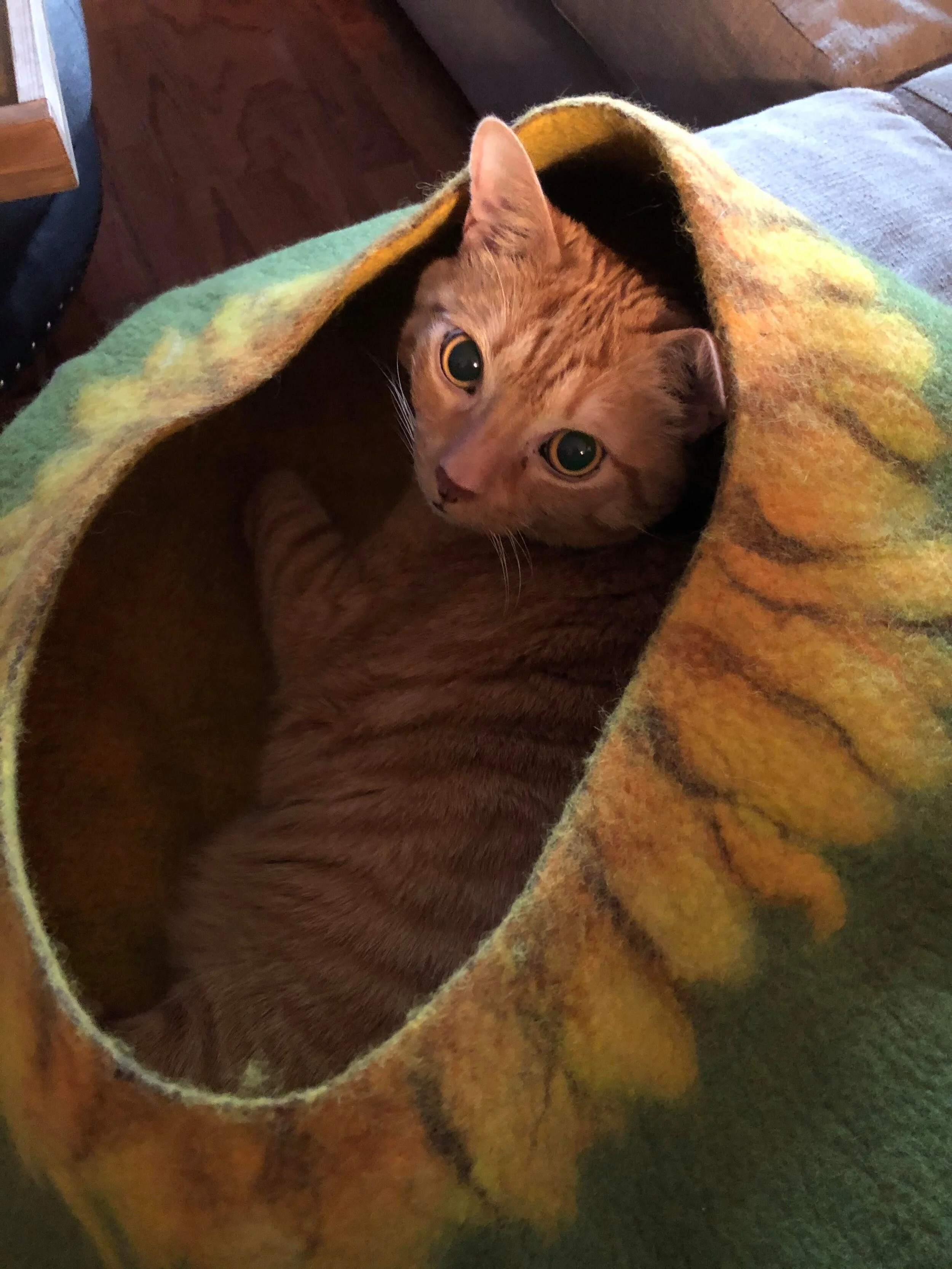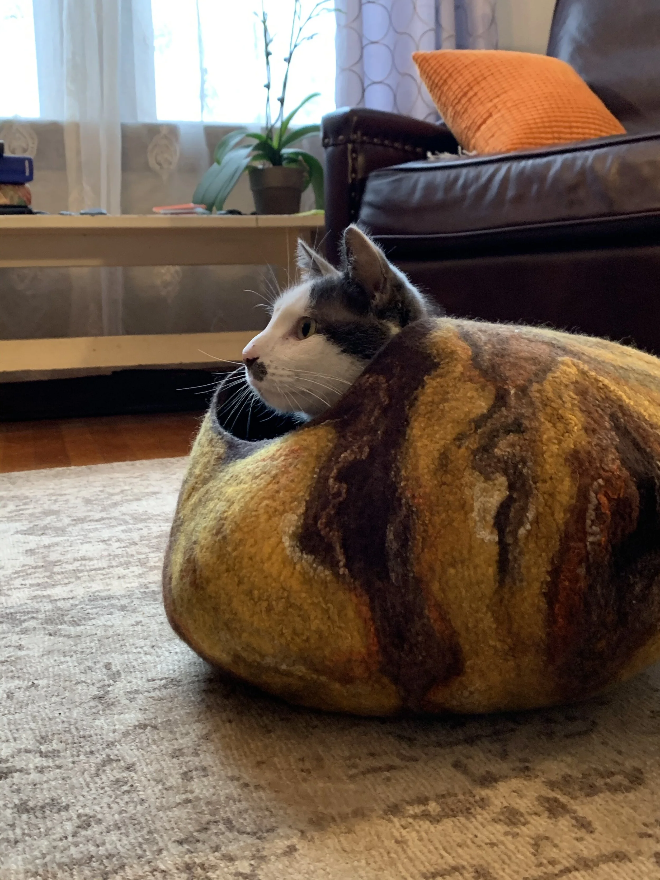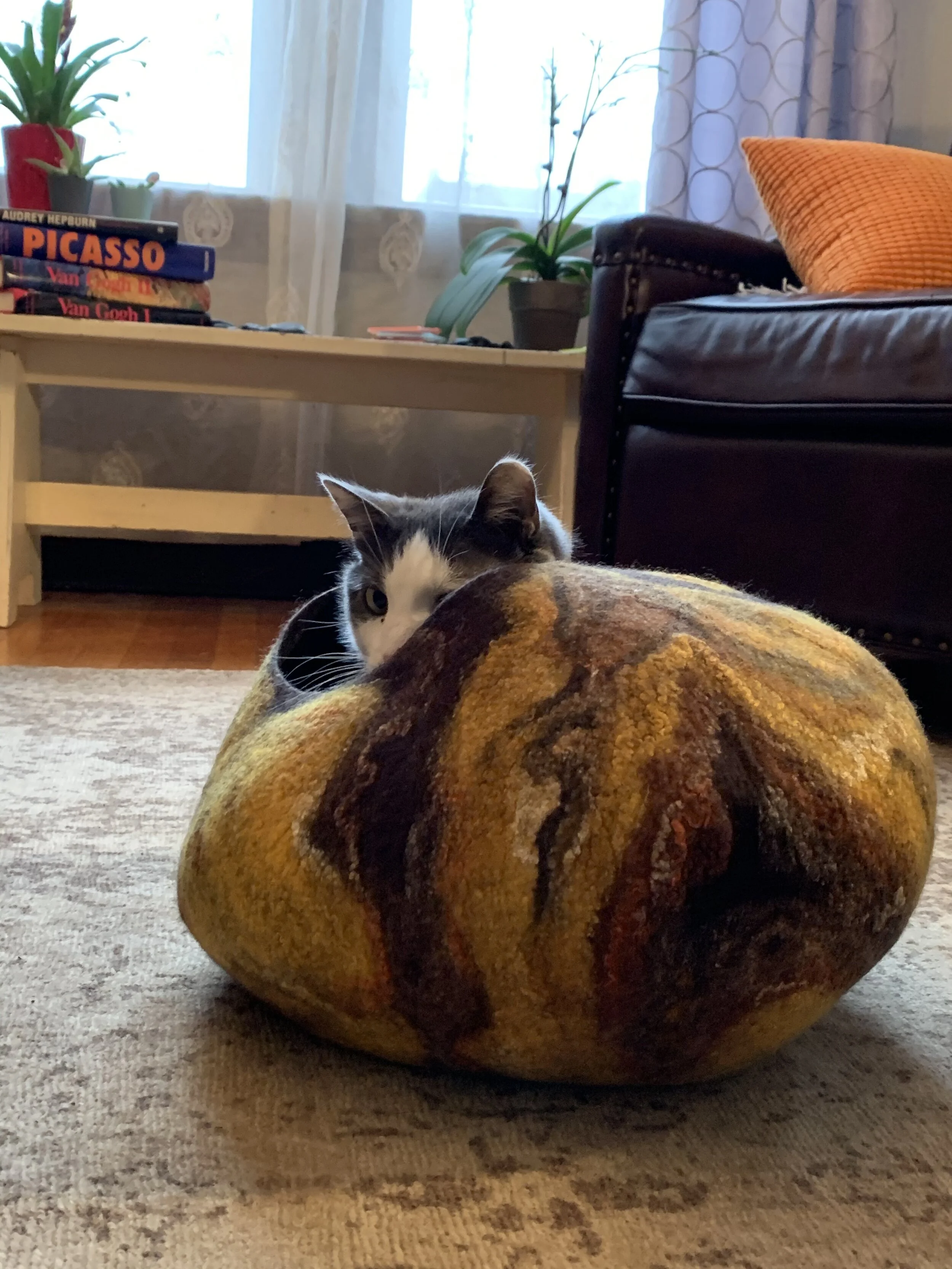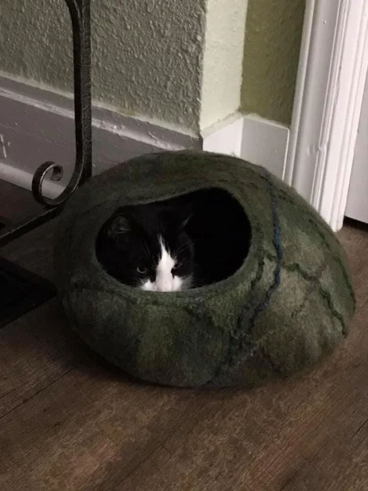 My cat caves are firmly felted with many layers of merino wool so they are soft and sturdy. I typically make them large (around 22 inches) with a wide opening (8-10 inches) to accommodate most cats. If you would like a cave feel free to browse through my selection or contact me and I will make one just for your special fur buddy.